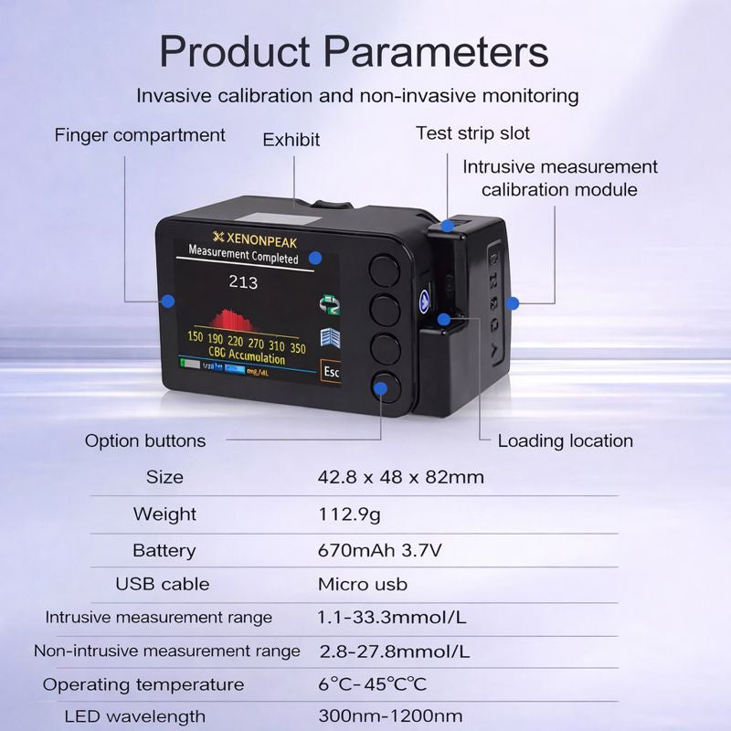 No more invasive and dangerous blood glucose testing methods! Measure your blood glucose safely, without the risk of cross-contamination or needlestick injuries on your fingers!